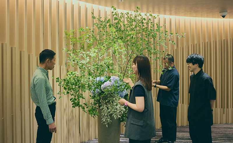 浦田:来客エリアのエントランスの花活けを見て、季節感というコンセプトが効いていてとてもいいなと思いました。生の花や草木にこだわったことで、立体感や奥行き感、みずみずしさを強烈に感じましたね。実に多くの種類、見たことのない植物が入っていたりするので、「これってフェイクかな?」とみんなが触りますし、そうやって触れ合っていると植物に愛着が湧いてきます。すでに鉢植えに向かって「この子」って呼び始めていますから(笑)。「この子はもっと光が当たるように向きをかえようか」と私たちの間でそういう会話が発生していて、それが今後、社員どうしの雑談になったりコミュニケーションのきっかけになったりするといいですよね。