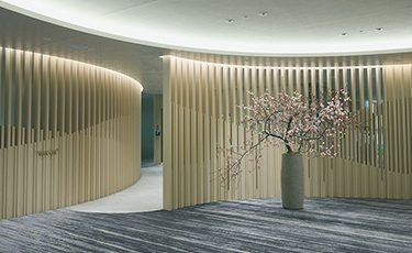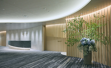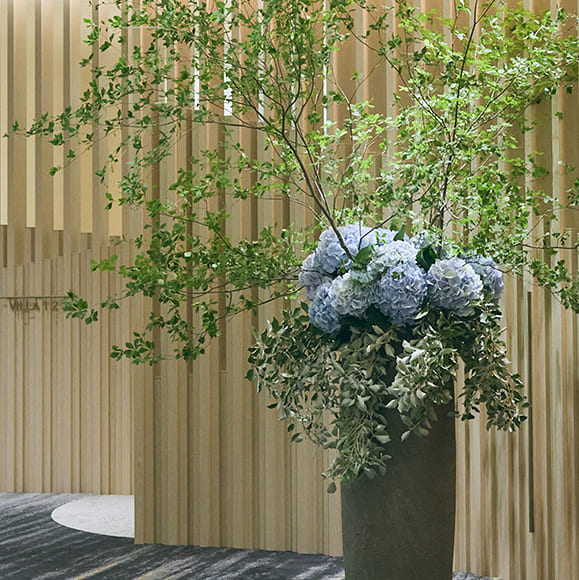 エントランスでお客様をお迎えするのは、大きな花器に活けられた季節の花々。四季折々の草木や花を月ごとに活け、週に一度はメンテナンスを欠かしません。来訪者に四季を感じていただくおもてなしです。