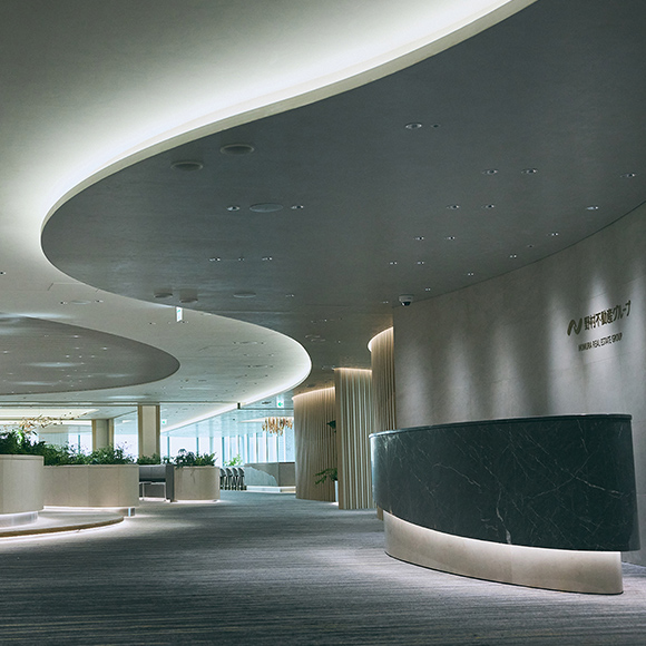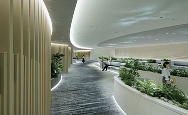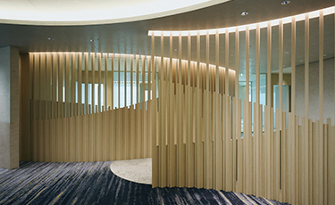 受付を抜けると、左手には棚田を感じさせるデザインのウェイティングスペース、右手には木ルーバーが設置されています。天井と床のカーペットの緩やかなラインが、明るい海側の景色へと視線を誘うアプローチに。木ルーバーの温もりある質感と、1つ1つ丁寧に設計された曲線的なデザインが調和し、来訪者を温かくお迎えします。
