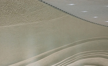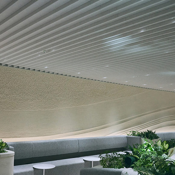 日本を代表する左官アーティスト・久住有生氏の作品。芝浦の由来である「芝の浦」にインスピレーションを得て、かつて武蔵野の端にあった芝村の景色をイメージしました。海から運ばれた風が一面に広がる芝をなびかせ、大地を駆け抜ける様を表現しています。横幅約16mもある大きな一枚作品は、久住氏にとっても初めてのチャレンジになったそうです。