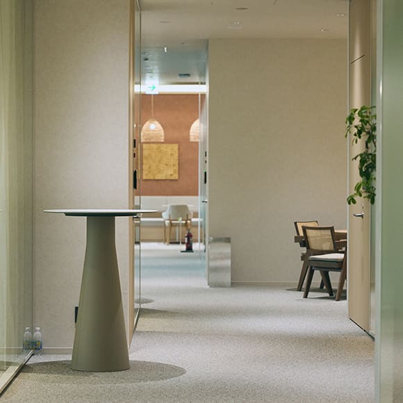 VILLAの通路にあるオープンスペースには、さまざまなタイプのデスクを設置。時間内に収まり切らなかった会議の延長戦や、ちょっとした打ち合わせが気軽にできるようになっています。