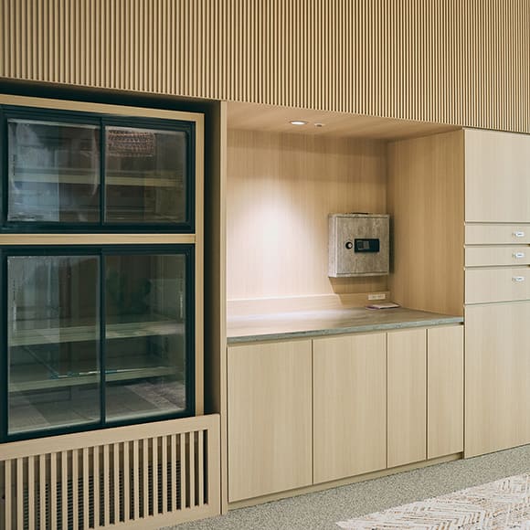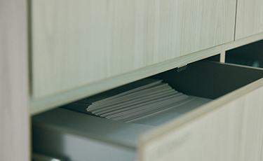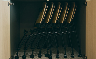 会議や打ち合わせ時に必要なものを集約した、VILLA COURT。来客用の飲み物はここから自由に持ち出し可。ゴミ箱は外から見えないように格納されており、補助椅子も完備しています。文具類や紙袋、封筒などもそろえているので「COURT」にくれば何とかなります。