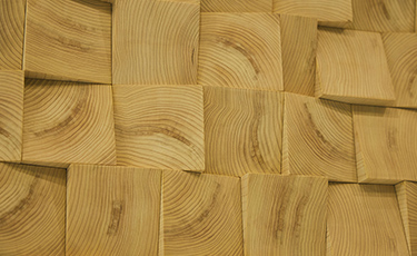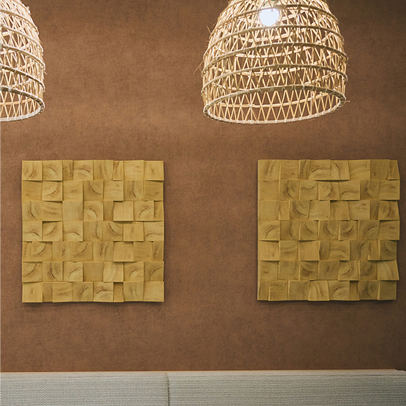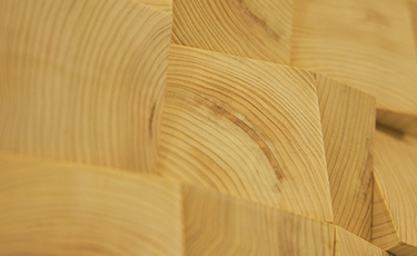 「つなぐ森」の「木と木、人と人をつなぐ」という概念をコンセプトに生まれたアート。素材となる切り株は、社員が製材所に行って選定。家具などに使用できない部分をアートにすることで、新たな生命を吹き込みました。斜めにカットされた「つなぐ森」の木材が、異なる方向に年輪を見せつつ重なり合って、1つの風景を作り出している様は、森が紡ぐつながりと対話のひとときを表現しています。