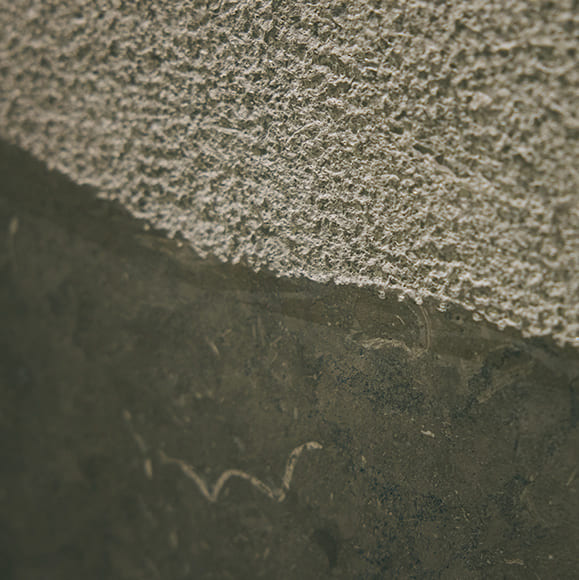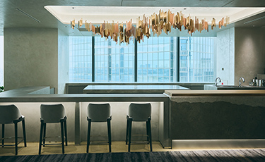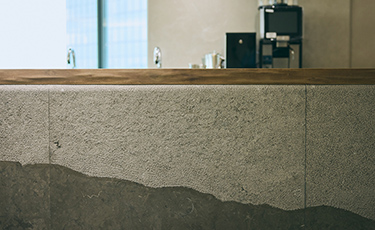 1枚の大きな石で作られた15階のドリンクカウンター。石の叩き方や磨き方をエリアによって切り分けながら、2つの異なる表情を醸し出しています。