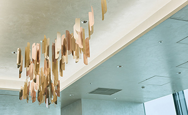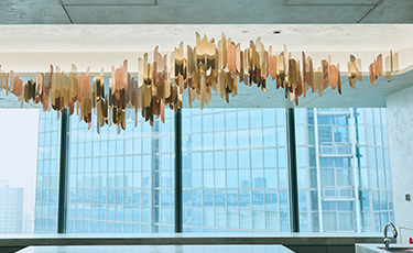 田中維新氏の作品で、タイトルは「Wind」。野村不動産グループ社員の熱気、上昇気流から生まれる風をイメージして制作していただきました。見る人の視線や動きによって表情を変える様は、まさに「宙に浮かぶ彫刻」とも言えます。