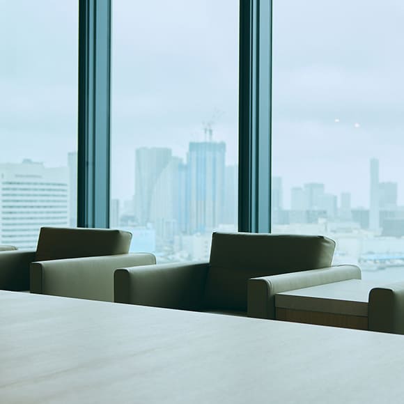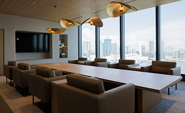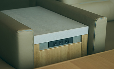 座り心地にこだわり、複数回にわたって選定したソファがある会議室。ひじ掛けにはコンセントを備え、くつろぎながら作業できる環境を整えました。高さなど細部にも工夫を凝らし、使いやすさを追求しています。