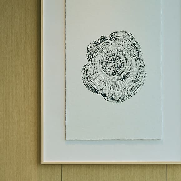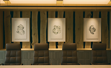 約70㎡の役員応接室には、「つなぐ森」をテーマにした木の年輪木拓のアートが3点展示されています。奥多摩の製材所まで足を運び、木材を選択。年輪の刻み方が異なる3つの木から、今までの歴史を感じていただければと思います
