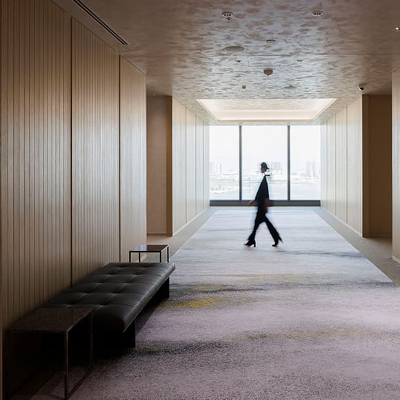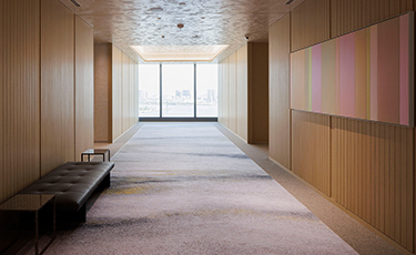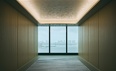 実は15階には、MAIN RECEPTIONのほかにもう一つ、SALON(役員応接室)専用のエントランスがあります。扉を開けると眼前に東京湾が広がり、うつろいゆく海の景色が目に飛び込んでくるよう、大きな窓を設けた空間になっています。