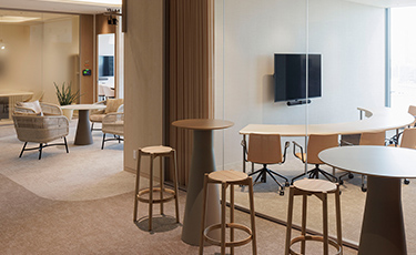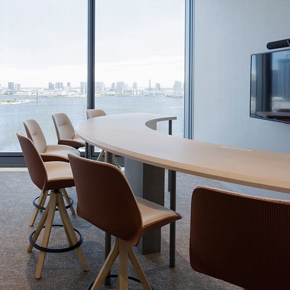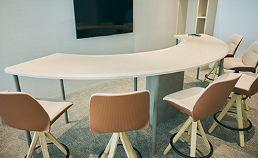 半円タイプで、全席モニターに向かって座るようになっている会議室。「共に同じものを見て考えよう」 同じ方向・同じ目標・同じ目的を目指して共創していきたいというコンセプトで設計されました。