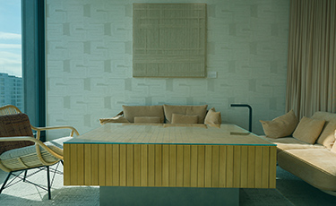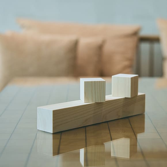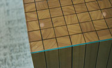 「つなぐ森」の木を有効活用し、木材を組み合わせてテーブルにしました。年輪の向きを工夫して組み合わせることで、上から眺めた際の美しさにもこだわって仕上げています。