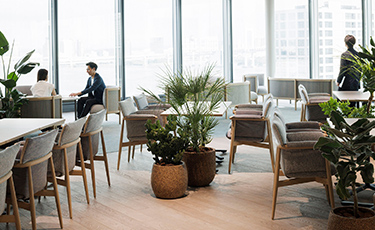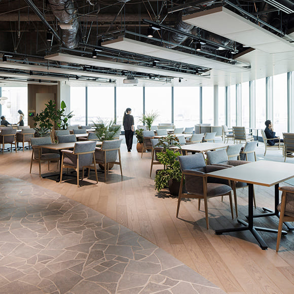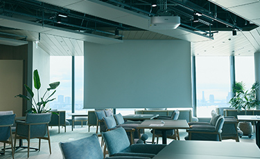 14階の海を望む場所に設けられた「クロスデッキ」では、ソロワークや社外との打合せに加え、社内外のピッチやイベント、ワークショップ、セミナーなど多様な活動が可能です。そのために120インチのプロジェクタースクリーンと約30脚の椅子を備えました。