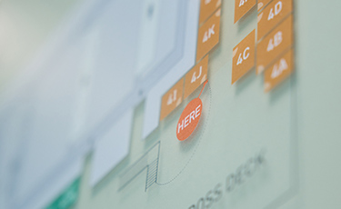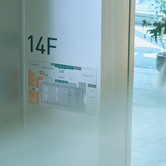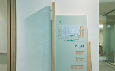 来客エリアには、随所に案内MAPを設置しています。曲がりくねった回廊やVILLA形式の迷路のようなオフィスを、MAPを見ながら散策できる仕掛けです。さらに、木製の立て看板を設けることで、自然な温もりを感じながら、探索する楽しさを提供しています。