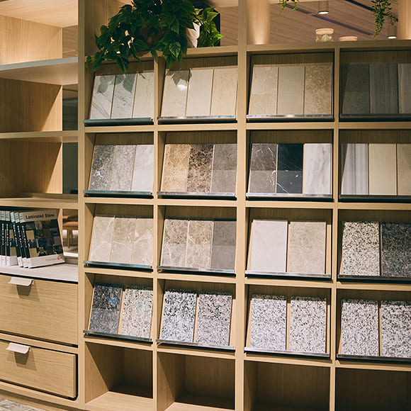 14階の共創エリアのアトリエは、今まで分散していたグループ全社の建築・インテリア系のマテリアルやサンプル帖等を集約しました。調光・調色システムを導入し、社内外の方と共にアイデアを形にしていく共創空間として設けました。