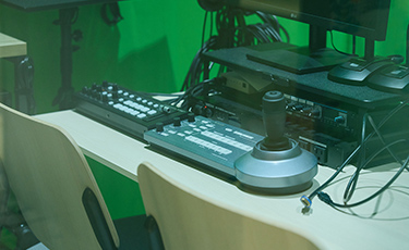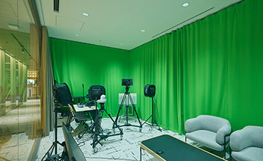 オンライン配信やセミナー配信なども可能な、配信用スタジオを設置。背景に画像を投影できるグリーンカーテン、座談会ができるソファー、持ち出し可能な機材なども完備しています。