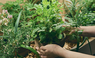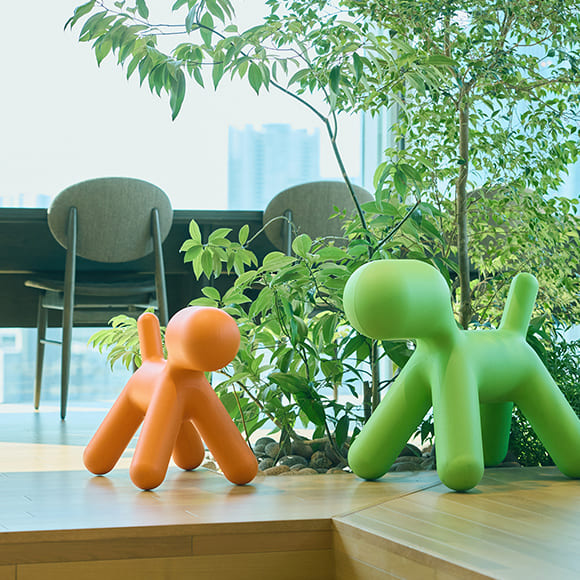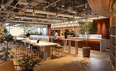 多肉植物やハーブに彩られたARUMON CAFEは、緑を通して人の気配を感じられる開放的な空間です。植栽で緩やかに仕切ることで、全体のつながりを保ちながら適度なプライベート感を演出。さらに、バジルやローズマリーなどのハーブを楽しめるエディブルコーナーを設け、食事に香りを添えたり、リフレッシュした気持ちで仕事に戻れる体験を提供します。緑に囲まれた心地よい空間で、自然と会話が生まれるひとときをお楽しみください。