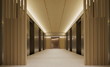 15階のエレベーターホールは、メインレセプションのデザインに合わせて木製ルーバーを採用し、統一感のある意匠を施しました。執務フロアとは異なる広がりのある空間を演出し、エレベーターを降りた瞬間から、訪問者に野村不動産グループならではの特別な雰囲気を感じていただけるよう配慮しています。