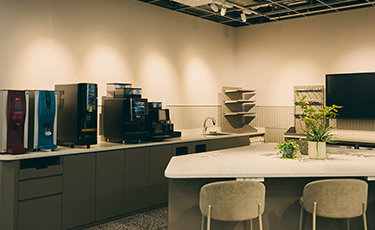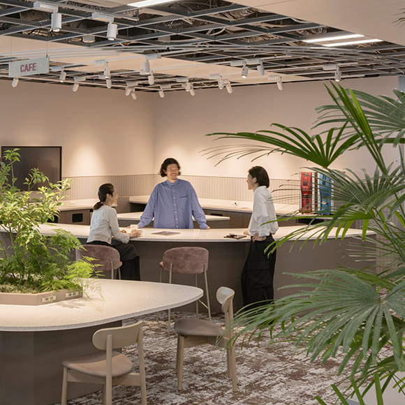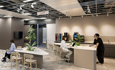 執務エリアには15カ所のカフェスペースがあり、ウォーターサーバーやコーヒーメーカー、デジタルサイネージ等を備えています。社員がちょっと立ち寄ることで、部門を超えた偶然のつながりや、挨拶や雑談から自然なコミュニケーションが広がるよう工夫されています。
