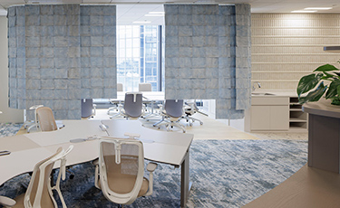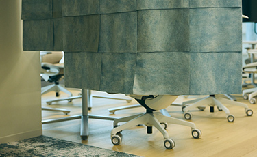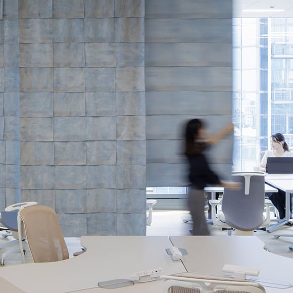 カーテンでゆるやかに区切られたスペースは、ミーティングや打ち合わせの場として活用できます。あえて足元は隠さず、人の気配がふっと伝わるようにデザインされているのがポイントです。
