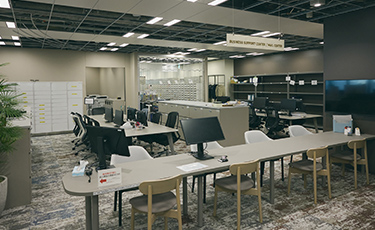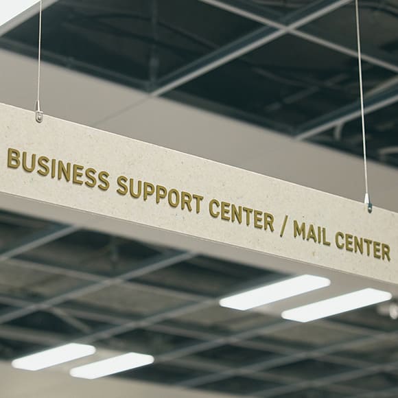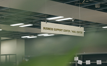コーポレート部門の業務をまとめて社員窓口を一本化したのが、ビジネスサポートセンター。困った時や相談したい時は、ここに来れば解決できます。機材レンタルや郵便物、請求書、宅配便の受け取り・発送もすべてこのセンターに集約しました。