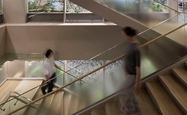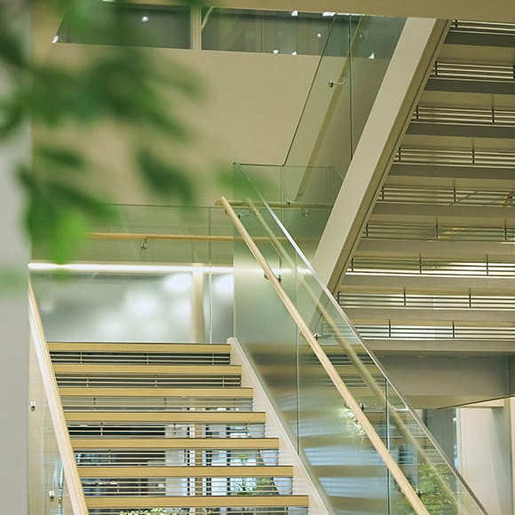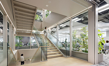 1フロア約1500坪のフロアに、上下のアクセス動線として設けたのは12箇所の内階段。横移動だけでなく、縦の移動も可能にすることで、社員同士のスピーディーな交流をサポートしています。