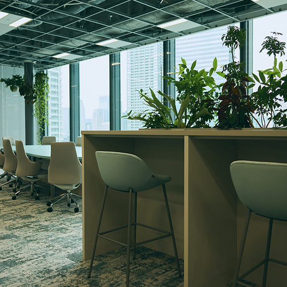 新本社では、WELL認証(インテリア)の最上位ランク「プラチナ」取得を目指し、社員の健康と快適性を重視した環境作りを進めています。ARUMON CAFEでは、野菜や果物など健康志向の食材を使ったメニューを提供し、カロリー・塩分・アレルギー情報を明示。執務エリアには上下昇降デスクや調整可能なチェア、モニタースタンドを導入し、照明の色温度調整や豊かなグリーンで心地よい空間を演出しています。さらに、ビジネスサポートセンターではUSB扇風機やブランケット、ノイズキャンセルイヤホンなどを貸与し、働く人の快適性を細やかにサポートしています。