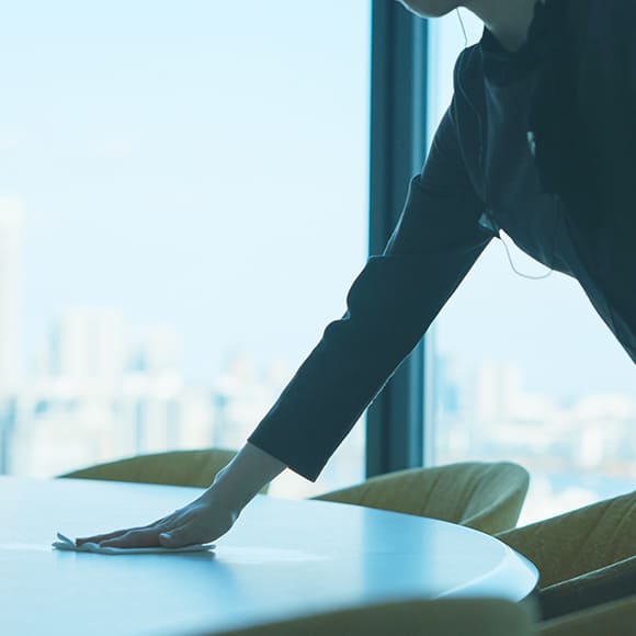 新本社では、社員がコア業務に集中できる環境を整えるため、従来各部署で行っていたノンコア業務を集約し、外部委託を導入しました。フロアを巡回する「フロアラウンド」のスタッフを配置し、移転前に社員が担っていた業務を引き取りながら、困りごとにきめ細かく対応しています。日常の挨拶や丁寧なコミュニケーションを大切にし、社員が気軽に声をかけられる雰囲気作りを意識。さらに、困りごとに気づいた際には、フロアラウンドスタッフから積極的に声をかけ、安心して相談できる環境を整えています。